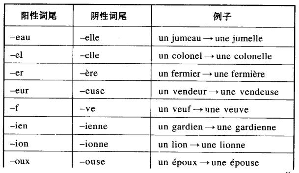此外,法語名詞的陰陽性轉換都必須遵循特殊的規則,或在詞末加后綴,或改變詞末輔音,或在詞末添加開音符。具體的變換規則請見下表: