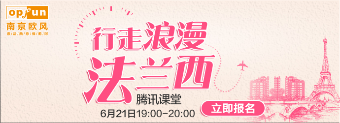 騰訊課程第30期法語講座——行走浪漫法蘭西,具體內(nèi)容如下 講座主題:行走浪漫法蘭西 講座時(shí)間:6月21日19:00-20:00 講座形式:騰訊課堂直播課程 報(bào)名地址:https://ke.qq.com/course/216675 歡迎撥打咨詢熱線:025-83236520 QQ:120095421