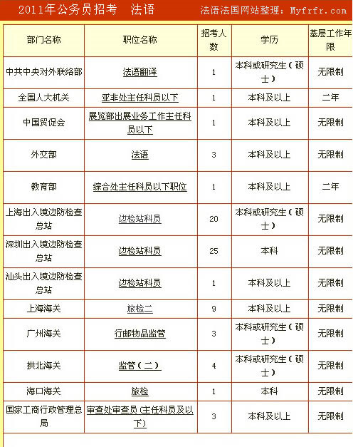 上海海關:9人 法語、西班牙語、俄語、韓語、日語 拱北海關:4人 日語、法語、德語、葡萄牙語 縣(區)級及以下 廣州海關:3人 日語、韓語、法語、德語、西班牙語 上海邊檢:20人 日語、韓語、西班牙語、法語、阿拉伯語 (面試錄用比5:1) 珠海防檢:6人 波斯語、葡萄牙語、土耳其語、馬來語、印度尼西亞語、蒙古語 天津邊檢:日語、俄語、朝鮮語、阿拉伯語