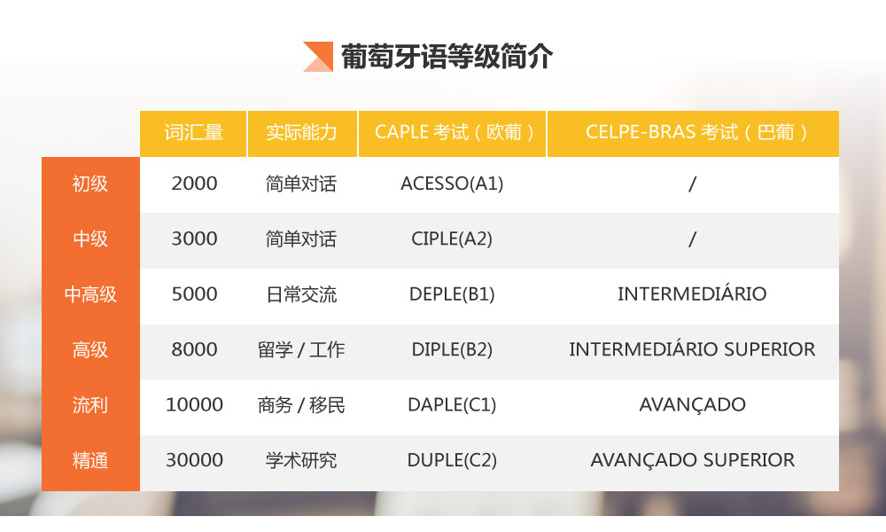 越來越多的同學(xué)學(xué)習(xí)葡萄牙語,也許是想去葡語國家留學(xué),也許是想提升工作競爭力,又或者源于對語言的情有獨鐘。 學(xué)習(xí)了一門語言,很多同學(xué)一定想通過考試獲取證書,多了一本證書,不僅僅是對自身水平的肯定,也可以為自己增加職場的砝碼,何樂而不為呢? 那么,同學(xué)們對葡萄牙語考試等級劃分了解多少呢,下面一張表格就會讓你一目了然噢~~